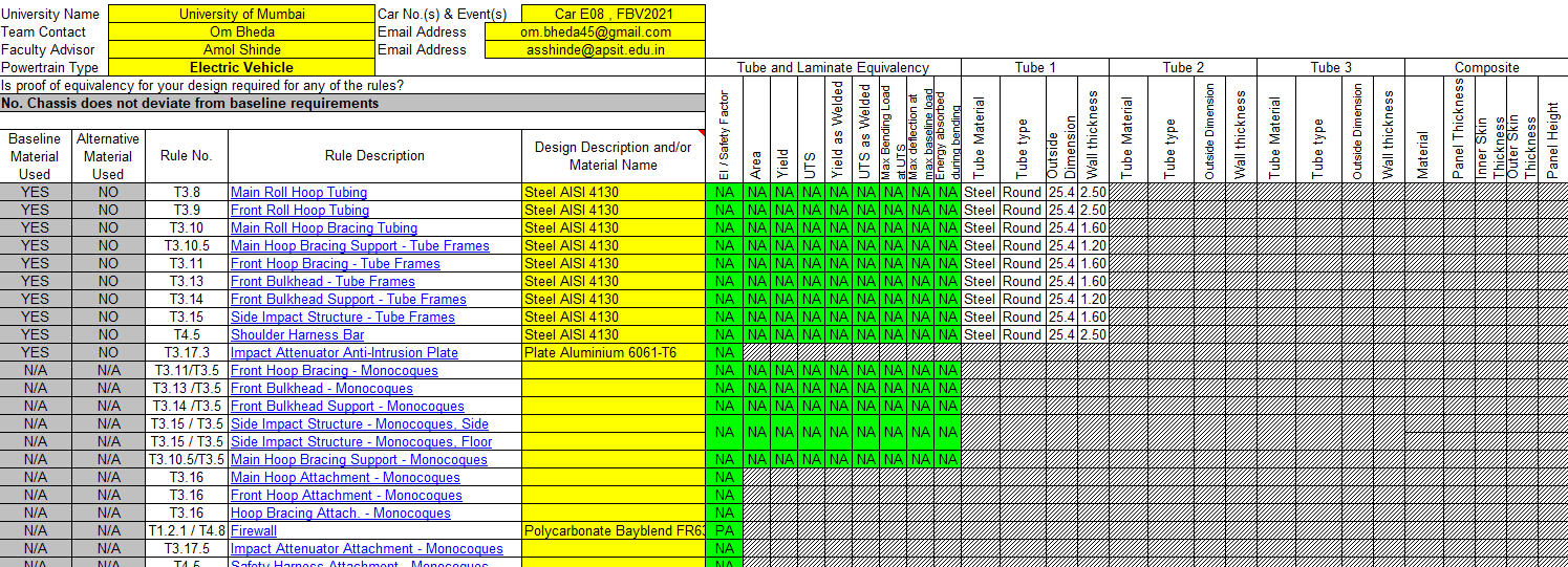 Team maintained and submitted technical documentation for each subsystem namely Structural Equivalency Spreadsheet (SES), DFMEA document (Design Failure Mode Effect Analysis), Impact Attenuator document (IAD).