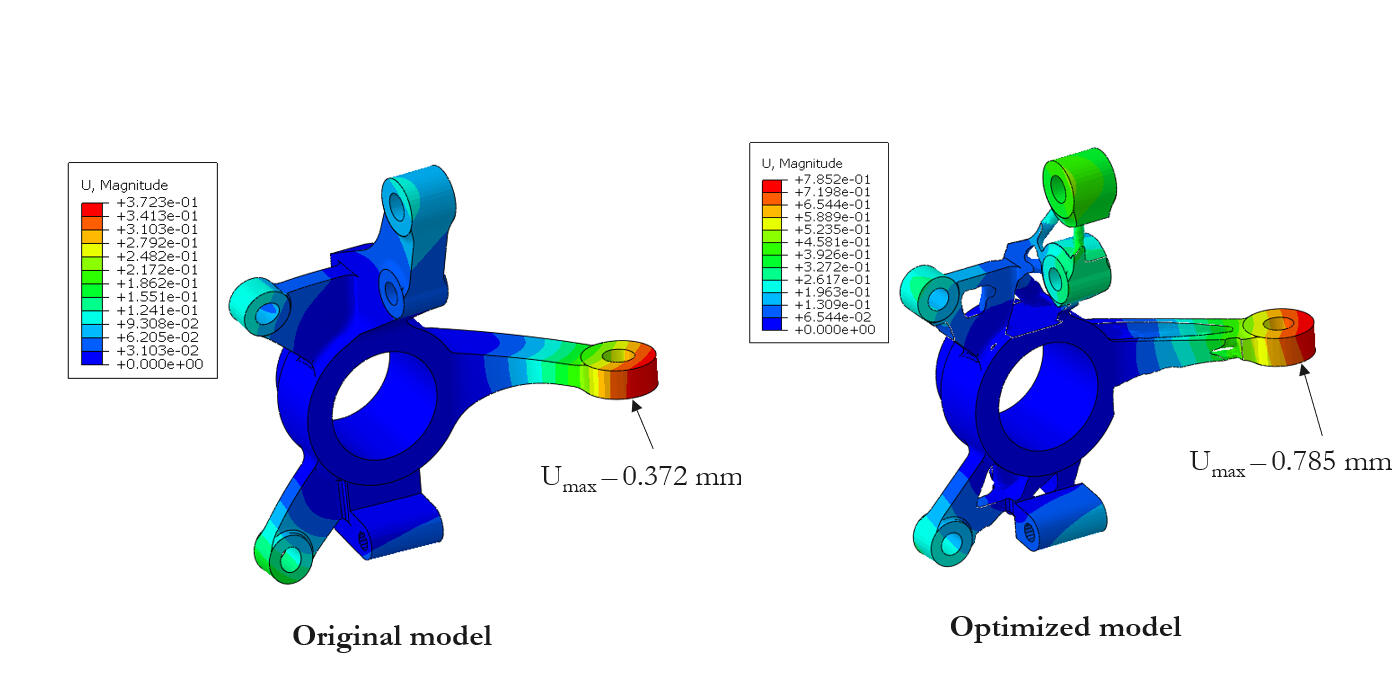 The original aluminum knuckle weighed 1.07 kg. After optimization, the mass was reduced to 0.65 kg—a 35% weight reduction—while maintaining structural integrity. Maximum displacement increased from 0.372 mm (original) to 0.785 mm (optimized), remaining within acceptable limits for performance and safety.