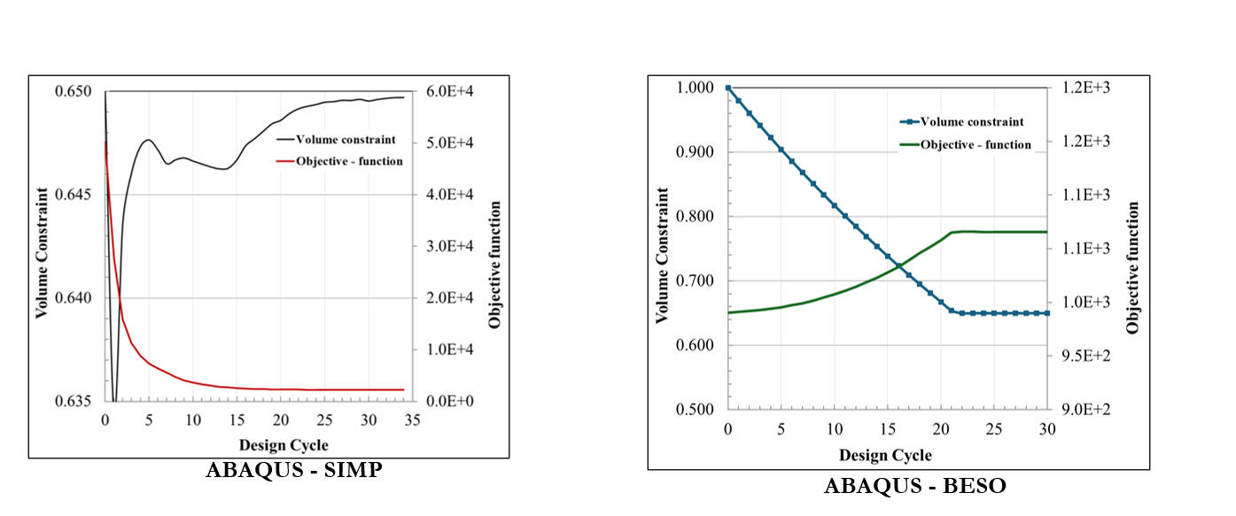 The BESO model converged in 30 design cycles with monotonic improvement in compliance and volume fraction, while the SIMP model converged in 34 cycles but exhibited minor fluctuations due to mesh and filtering effects.